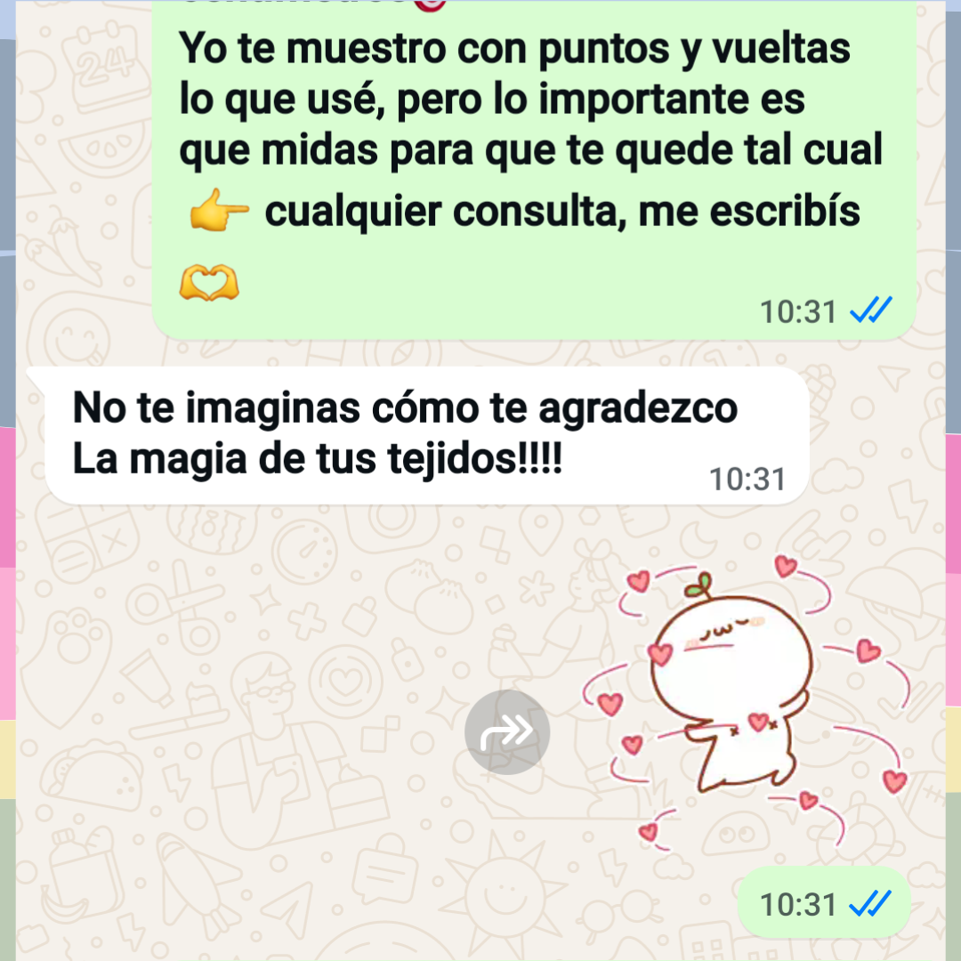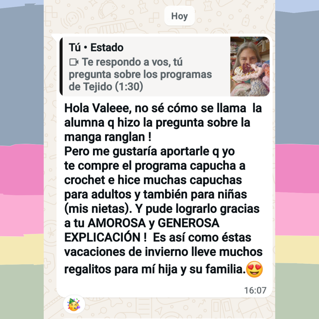 Estoy muy feliz con mi primer trabajo en crochet y logré hacer la capucha. No entendía nada de nada y con la guía y enseñanzas de la maestra Valeria lo terminé! Ella siempre está dispuesta a responder tus preguntas y con mucha motivación te ayuda a continuar... ¡Estoy descubriendo este lado mío del crochet y agradezco mucho la generosa ayuda de la maestra Valeria! ¡muchas gracias!