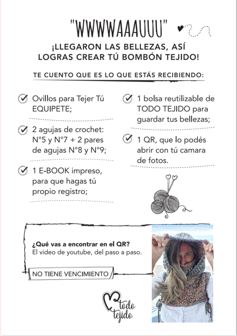 Este combo está pensado para que empieces a tejer sin perder tiempo buscando materiales ni adivinando cómo seguir.