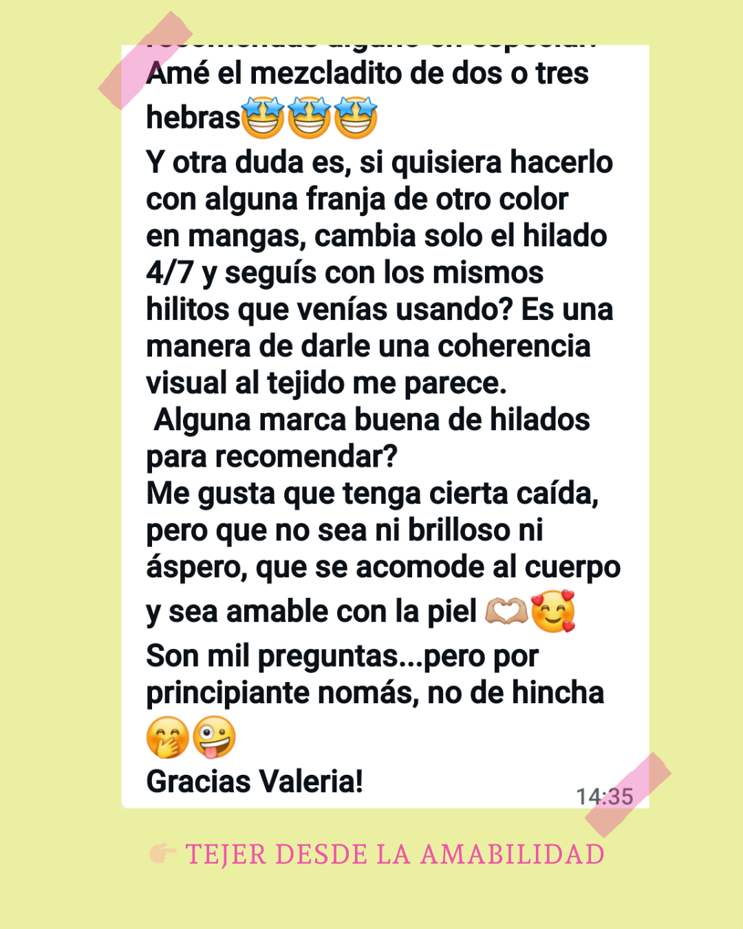 Estoy muy feliz con mi primer trabajo en crochet. No entendía nada y, con la guía de Valeria, logré terminarlo. Siempre está disponible para responder preguntas y motivarte a seguir. Descubrí un lado mío que no conocía.